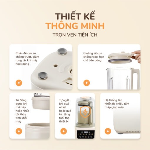Không chỉ an toàn, UNIE UCB15 còn sở hữu thiết kế thông minh với hàng loạt tính năng bảo vệ: chân đế cao su chống trượt giúp giảm rung lắc khi máy hoạt động, gioăng silicon chống trào hạn chế bắn bỏng, tự động dừng khi mở nắp hoặc nhấc cối khỏi máy, tự ngắt khi quá nhiệt hoặc quá tải để bảo vệ động cơ và tăng tuổi thọ thiết bị. Bên cạnh đó, hệ thống tản nhiệt đa chiều tầm thấp giúp máy hoạt động ổn định, bền bỉ, ngay cả khi sử dụng với công suất cao.