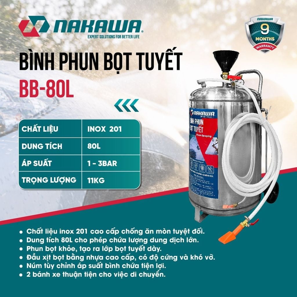 – Bình Phun Bọt Tuyết 80L Nakawa BB-80L được làm từ thép không rỉ sét, sử dụng bằng hơi nén tiết kiệm được thời gian khi sử dụng. Giúp rửa sạch tất cả các loại xe ô tô, xe máy một cách nhanh chóng và không cần chạm. Thích hợp cho gara rửa xe ô tô, cửa hàng rửa xe máy chuyên nghiệp.