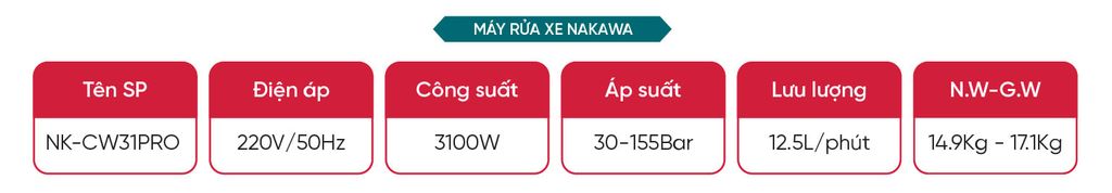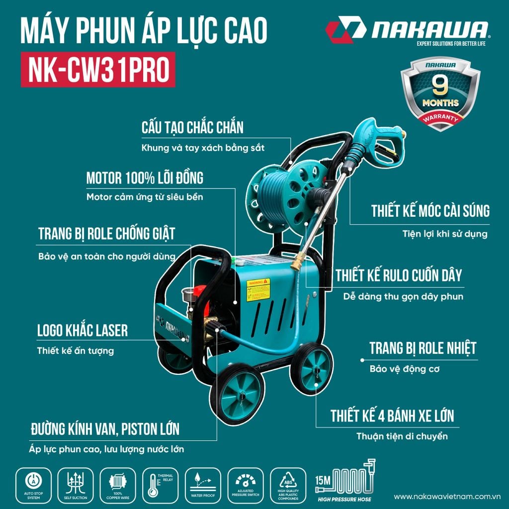 Máy phun áp lực NAKAWA NK-CW31PRO hay còn gọi là máy rửa xe áp lực cao được sản xuất theo tiêu chuẩn chất lượng Nhật Bản, với thiết kế tính năng vượt trội so với các dòng máy rửa xe xách tay thông thường.