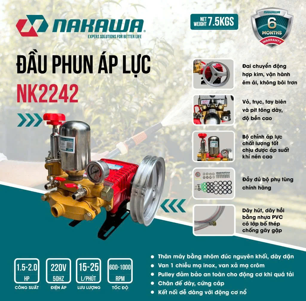 Đầu Phun Xịt Nakawa 2Hp NK-2242 là sản phẩm mới của thương hiệu Nakawa công nghệ Nhật Bản. Máy có hiệu suất làm việc mạnh mẽ hơn và áp lực nước lớn hơn. Giúp bạn dễ dàng xử lý mọi vết bám bẩn trên xe hoặc tường, sân, vườn .v.v. Còn được gọi là đầu máy rửa xe công nghiệp, sản phẩm có nhiều ưu điểm và tính năng vượt trội. Máy mang lại nhiều lợi ích và tiện lợi khi sử dụng.