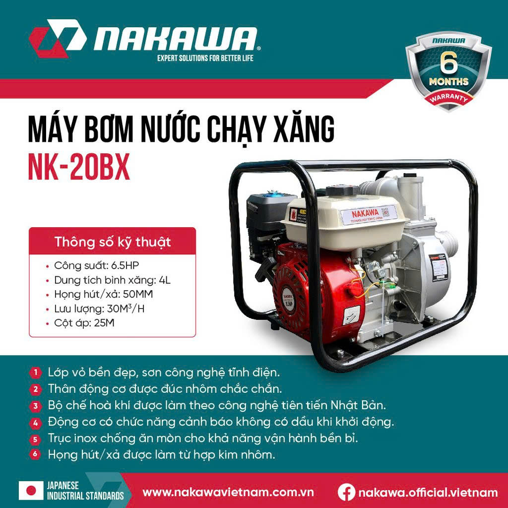 Máy Bơm Nước Chạy Xăng 6.5Hp Nakawa NK-20BX được sản xuất trên công nghệ hiện đại của Nhật Bản tích hợp với những tính năng ưu việt: thân máy dày chắc khoẻ, độ chính xác cao, thân thiện với môi trường, đạt tiêu chuẩn an toàn khi sử dụng.