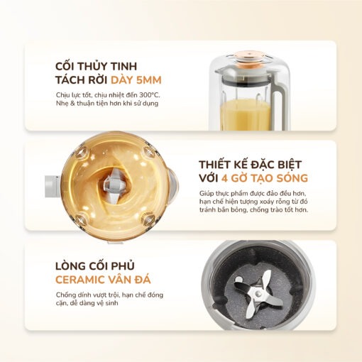 Máy được trang bị công suất xay 350W, đủ mạnh để nghiền nhuyễn các loại hạt cứng như óc chó, hạnh nhân, mắc ca hay đậu nành… Kết hợp cùng công suất nấu 1000W giúp gia nhiệt nhanh, đảm bảo sữa hạt chín đều, sánh mịn không cần rây lọc & hạn chế hiện tượng tách lớp phân tầng.