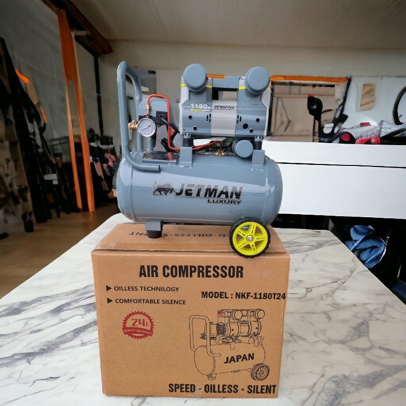 Máy Nén Khí Không Dầu Jetman 24L 1.5Hp NKF-1180T24 Lên Hơi Nhanh được sản xuất trên công nghệ hiện đại của Italy tích hợp với những tính năng ưu việt: thân máy chắc chắn, được phủ lớp sơn công nghệ tĩnh điện, máy chạy êm, thân thiện với môi trường, đạt tiêu chuẩn an toàn cao khi sử dụng.