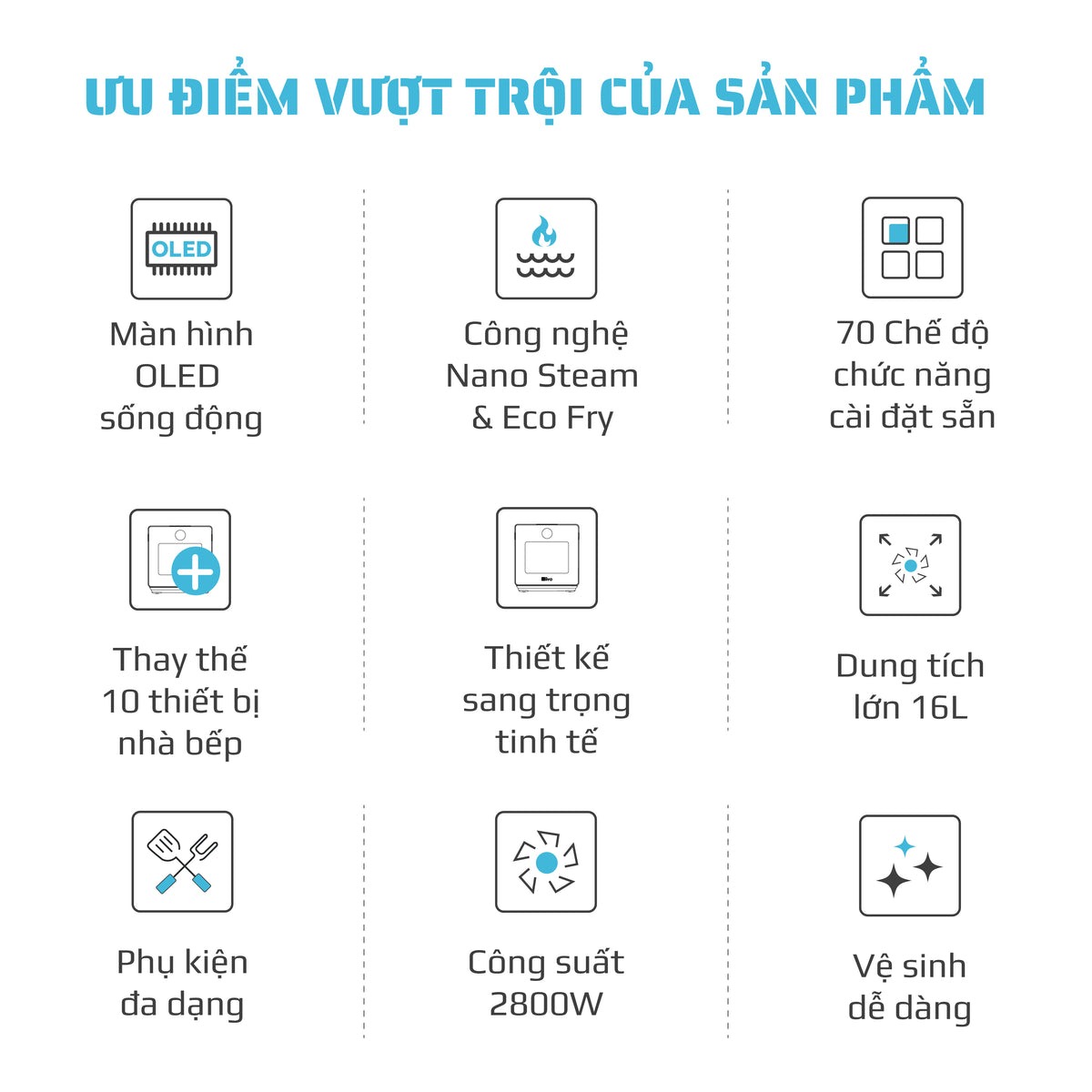 Chiên không dầu chiên đồ ăn vàng giòn mà không cần dùng đến dầu mỡ, giảm đến 95% lượng dầu mỡ dư thừa trong bữa ăn hàng ngày. Trong khi đó, hấp đồ ăn bằng hơi nước siêu nhiệt giúp giảm thời gian hấp, đồng thời bảo toàn tối đa dinh dưỡng có trong thực phẩm.