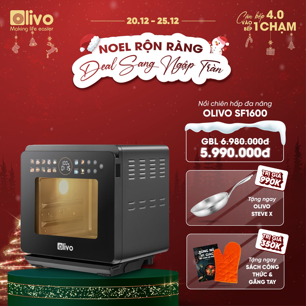 Phiên bản đặc biệt, cao cấp nhất của hãng nồi chiên hấp đa năng OLIVO SF1600 với cải tiến vượt trội được trang bị màn hình OLED hiện đại, hiển thị hình ảnh sống động, sắc nét, tích hợp tới 70 chế độ, chức năng cài đặt sẵn gần gũi với ẩm thực Việt. Nhờ công nghệ hiện đại, nồi chiên hấp còn giúp bạn chế biến các món ăn một cách lành mạnh, giảm thiểu lượng dầu mỡ, bảo toàn tối đa chất dinh dưỡng, mang đến những bữa ăn ngon miệng và tốt cho sức khỏe cho cả gia đình.